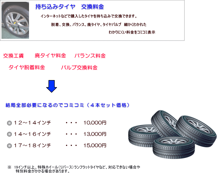 ※ タイヤのみの持ち込みの場合は割引させていただきます。